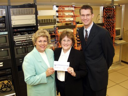 Dr. Linda Avant, OSU-Okmulgee executive vice president, left, accepts a $20,000 check from SBC Area Manager for External Affairs Rhonda Sellers that will enable the college's Information Technologies Division to establish a new SBC Telecommunications Lab. The grant will buy software and hardware to upgrade and install network and computer equipment donated by a number of Tulsa-area technology companies. OSU-Okmulgee IT Division Chair Scott Newman, right, helped compose the proposal that won the grant.