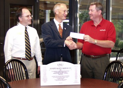 First National Bank and Trust of Okmulgee President Nevyle Cable, right, presents a $15,000 check to OSU-Okmulgee President Bob Klabenes, center, and Hospitality Services Division Chair Scott Galloway.